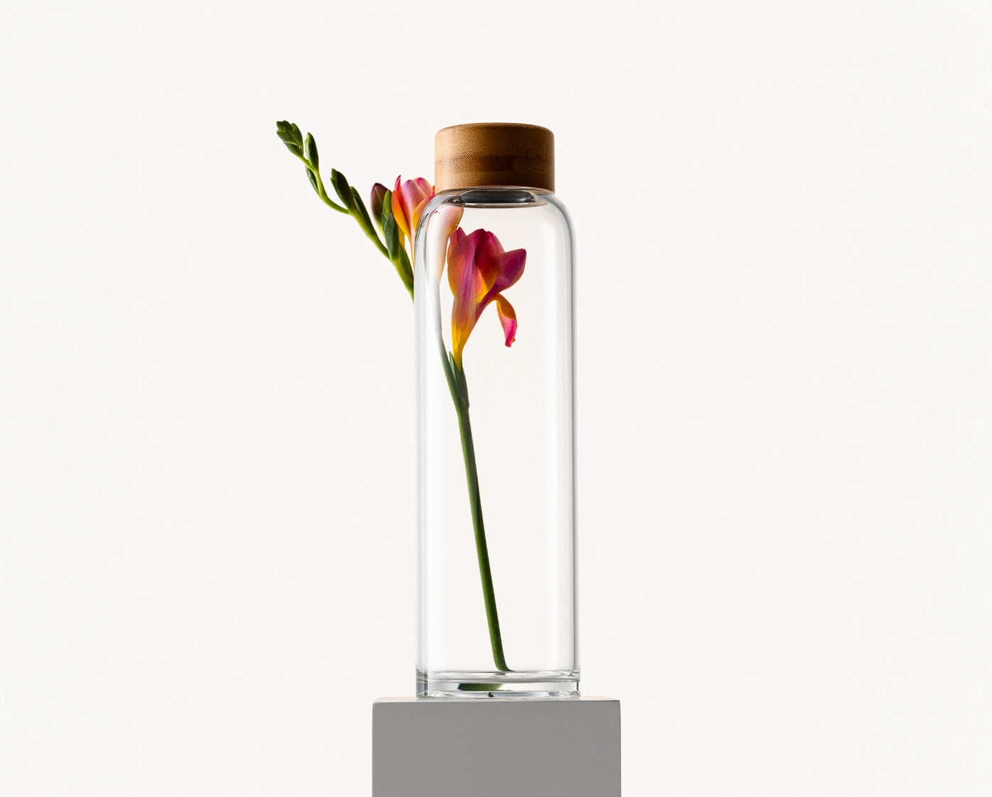 Die Flasche aus kristallklarem, handgefertigtem Borosilikatglas ist robuster, leichter, kratzfester, nachhaltiger und temperaturbeständiger als herkömmliche Flaschen. Ein verstärkter Boden sorgt für besseren Aufprallschutz. Sie ist geeignet für Spülmaschinen, Kohlensäure und Kalt- und Heißgetränke. Der hochwertige und auslaufsichere Bambusdeckel verleiht der Flasche zusätzliche Eleganz.